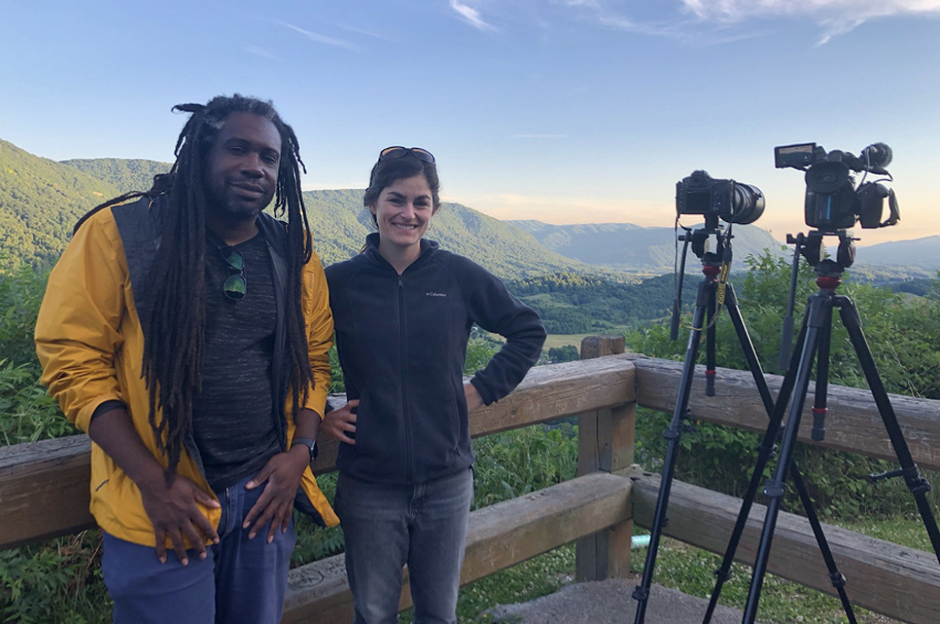 Cinematographer Raymond Thompson Jr. (left) and director Sylvia Ryerson in a behind-the-scenes image from Calls from Home. (Image courtesy of Working Films.)